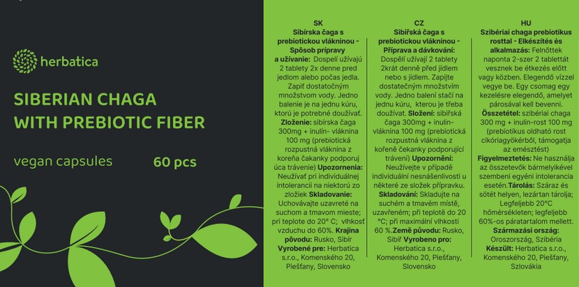 | Zloženie | sibirská čaga ( obsah v 1 kapsule 300 mg ), inulín ( obsah v 1 kapsule 100 mg ) Inulín = prebiotická rozpustná vláknina z koreňa čakanky podporujúca trávenie |