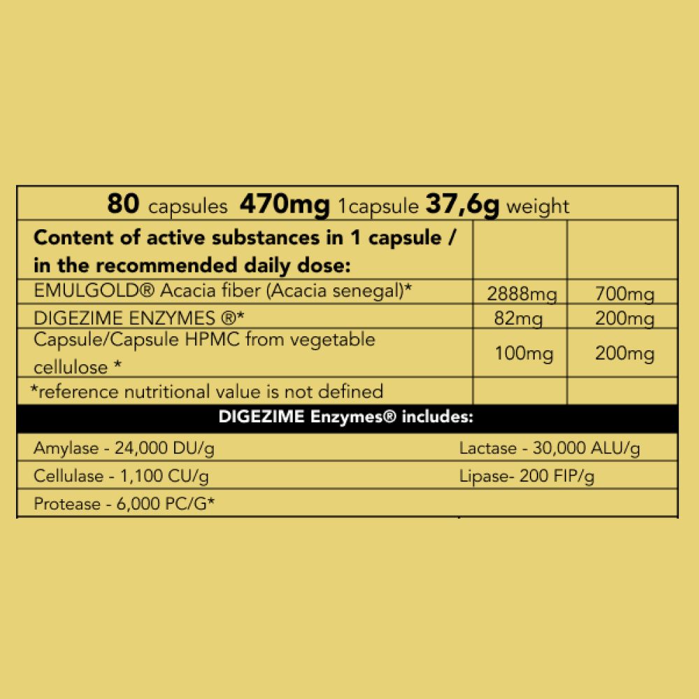 Zloženie: DigeZyme® (amyláza, proteáza, lipáza, laktáza, celuláza), EMUGOLD® (akáciová vláknina), rastlinná kapsula (HPMC).