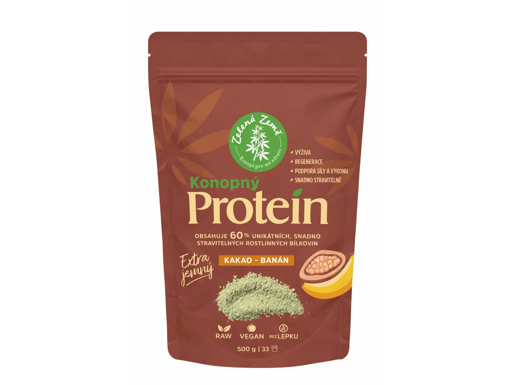 Konopný proteín EXTRA jemný (60 % bielkovín) kakao–banán, 500 g – Zelená Země